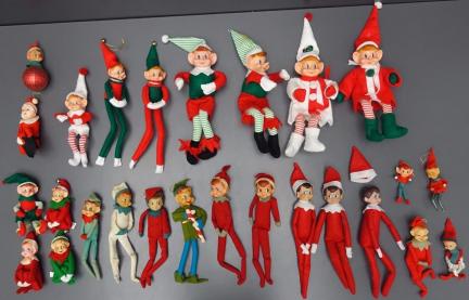 elves lots of elf christmas decor decorations decoration shelf tree table clothes |
