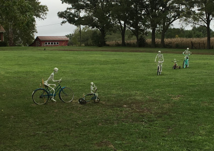 Skeleton riders riding bicycles bicycle bikes bike halloween display decor katy trail boonville mkt farmhouse farm house |