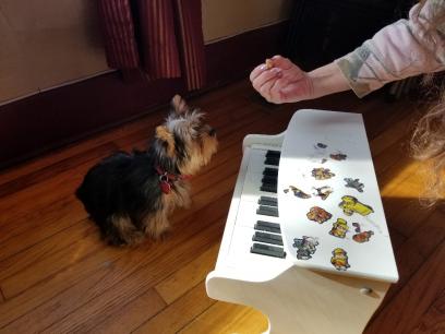 yorkie plays learns trick piano yorkshire dog puppy taining |