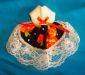 This is one cute little piRATe Dress with double trim (lace and gold (colored) coins) around the bottom with a cute little Black Bow at the back of the neck!