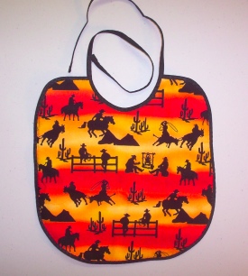 Here is a cute little baby bib. It is the same pattern (I made) that I used for my own children. It is a large bib (approx 11" x 11 1/2") that will catch the spills. It is backed with an absorbent quilted fabric and has a good length for straps to easily tie behind the baby's head.