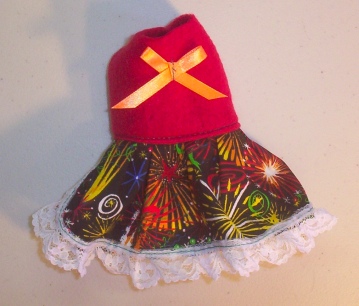 All of my items are my own design and pattern. This one is a cute little FIREWORKS! Print Dress with RED fleece top with WHITE Lace and Little ORANGE Bow.