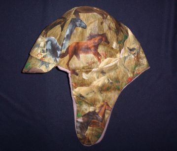 This hat is size Large/X-Large and is made with a cotton blend, horse print, fabric and lined with a good grade polar fleece. It will velcro under your chin or up over your head for warmer days with a generous strip of velcro. It also has a brim to keep the winter sun glare out of your eyes. No two hats are exactly alike.