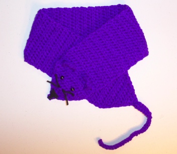 The scarf has been hand crocheted stitch by stitch. It is approx. 31" long not including an approx 9" tail and is about 4 1/2" wide. The rat is Purple with black pony bead eyes and black yarn for the nose and whiskers. The ears stand out.