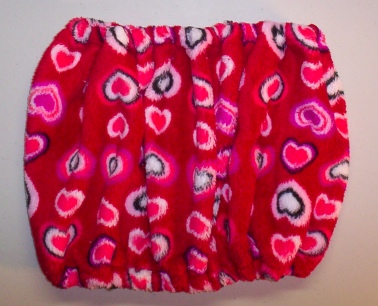 This item is made to fit most people Rattie Caddy in a Heart Print Super Soft, Super Warm, fleec. It will hold one or more ratties while they sleep, eat or play in it as you wear this around your neck. This item goes on over your head and will sit around your neck. You will stay warmer and your ratties will love to play and sleep within.