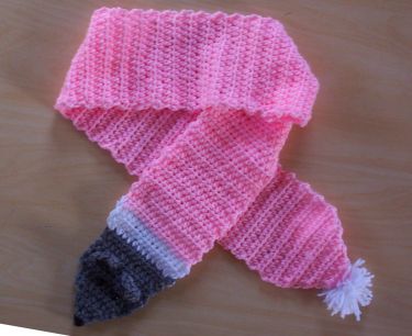The scarf has been hand crocheted stitch by stitch. It is approx. " long and is about 4 1/2" wide. The rat is gray with black pony bead eyes and black yarn for the nose. The ears stand out. The Ski Hat has a White Band and a Pink Hat with a White Pom Pom on the end.