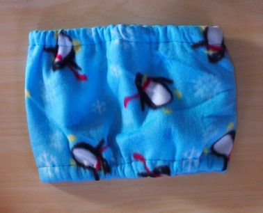 This item is a Blue Penquin Print, THICK polar fleece, Rattie Caddy. It will hold one or two ratties while they sleep, eat or play in it as you wear this around your neck. This item goes on over your head and will sit around your neck. You will stay warmer and your ratties will love to play and sleep within.
