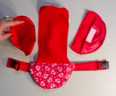 This Duck Diaper Holder Harness is made with Red Heart Valentine's Day Print with matching two removable diaper inserts , backed with a waterproof fabric and it is oh so cute. This Duck Diaper Holder can be lined with a sanitary napkin, a human baby diaper, a folded newspaper page or other folded papers such as paper towels or other papers to be recycled.