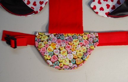 This Goose Diaper Holder Harness is made with Candy Heart/Valentine's Day Print, backed with a waterproof fabric and it is oh so cute. It has a small ring for a light weight leash with a small hook. This Goose Diaper Holder can be lined with a sanitary napkin, a human baby diaper, a folded newspaper page or other folded papers.
