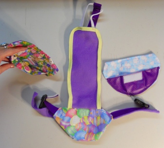 This Duck Diaper Holder Harness is made with Fancy Egg Print with matching two removable diaper inserts , backed with a waterproof fabric and it is oh so cute. This Duck Diaper Holder can be lined with a sanitary napkin, a human baby diaper, a folded newspaper page or other folded papers such as paper towels or other papers to be recycled.