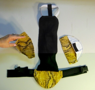 This Goose Diaper Holder Harness is made with Cute Snake Print Polar Fleece, backed with a waterproof fabric and it is oh so cute. It has a small ring for a light weight leash with a small hook. This Goose Diaper Holder can be lined with a sanitary napkin, a human baby diaper, a folded newspaper page or other folded papers.