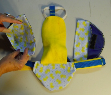 Duck Diaper Holders are, in my opinion, the only way to have a duck in the house, vehicle or a person's lap. This one is my own design that I fashioned for our own housegoose, Eden and Houseduck Phebe. The photo shows all the items you will receive.