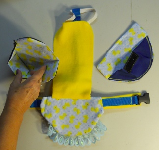 Duck Diaper Holders are, in my opinion, the only way to have a duck in the house, vehicle or a person's lap. This one is my own design that I fashioned for our own housegoose, Eden and Houseduck Phebe. The photo shows all the items you will receive.