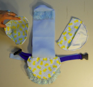 Duck Diaper Holders are, in my opinion, the only way to have a duck in the house, vehicle or a person's lap. This one is my own design that I fashioned for our own housegoose, Eden and Houseduck Phebe. The photo shows all the items you will receive.