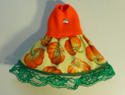 These little dresses are made in a variety of ways. This one is a Cute Pumkin Print Dress with cute little silver toned Pumpkin Charm! I wish the photos showed the outfits better then they do.