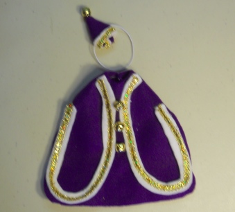 All of my items are my own design and pattern. This is a cute little idea was Santa Inspired. It is made with Royal Purple polar Fleece and has Fancy Gold Trim and a Ringing Goldtoned Bells and comes with the matching hat.
