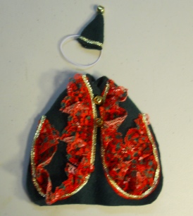 All of my items are my own design and pattern. This is a cute little idea was Santa Inspired. It is made with Green Polar Fleece and has Lots Of Christmas Lace and Fancy Gold Trim and a Ringing Goldtoned Bells and comes with the matching hat.