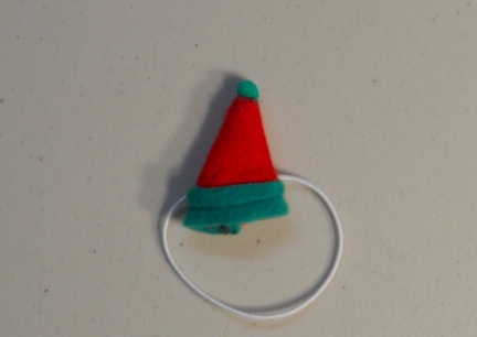 This is cute and even cuter with a small pet head under it. It is Hamster Gerbil sized Elf Hat. It stays on your pet's head with elastic. The elastic is left long when it arrives to you so that you can cut it or tuck it to fit your own Pet. If you have a dark colored pets, use a permanent marker to color the elastic. Just let it dry well before putting the hat on your pet.