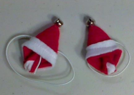 This hat is made of quality polar fleece in Red is trimmed in White polar fleece with White with a ringing Silver Bell on top. The hat attaches to your pet's head with elastic. If you have a dark colored pet you might want to dye the elastic with a permanent marker, let dry before placing on the pet's head.