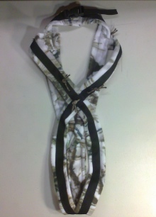 This multipurpose harness will fit most dog that weigh approx. 74 - 101 pounds. It is made with BLACK poly webbing with BEAUTIFUL WHITE CAMO PRINT polar fleece padding. The black quick release buckle has extended polar fleece for padding.