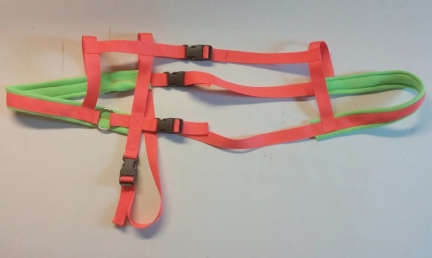Goat Harness Facts: Webbing: ORANGE Polly Webbing Padding: LIME GREEN Polar Fleece Rings: Heavy Weight Welded Metal Buckles: Quick Release Heavy Weight High Impact Plastic