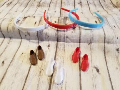 These are really cute and were made for the Mimi Bobeck body that Chubby Blythes heads are set on. With this lot you will receive all three pairs of shoes, white, brown and red, as well as three Headbands, white, red, and light blue.