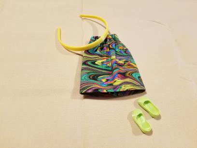 With this lot you will receive what you see in the photo. The cute Melted Wax looking Wave Print Skirt, the Limeish Green Pair of Shoes (that click on from the little toe over and STAY on the foot!) as well as the Yellow Headband.
