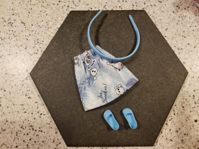 With this lot you will receive what you see in the photo. The cute little Frozen Print Skirt, the Light Blye Pair of Shoes (that click on from the little toe over and STAY on the foot!) as well as the matching Headband.