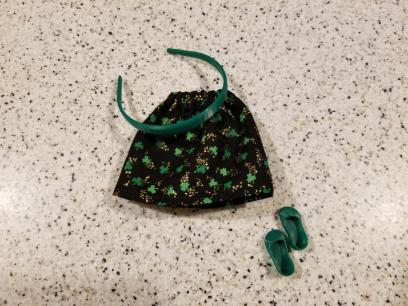 With this lot you will receive what you see in the photo. The cute little Gold and Shamrock Print Skirt, the Green Pair of Shoes (that click on from the little toe over and STAY on the foot!) as well as the matching Headband.