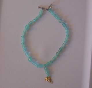 ONE OF A KIND!! THIS ANKLE BRACELET IS APPROX. 11" LONG, size Extra Large. It is made from Clear Turquoise or Aquamarine or call it Ice Blue colored Beads. THE RATTIE CHARM IS APPROX 1/2" WIDE AND HUNG on the same type beads.