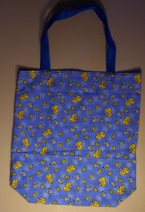 This is a fun item. This tote bag is Large sized, approx. 14 1/2" x 15 1/2". This tote dose not have a gusset (the depth factor). All seams are reinforced, and built for use. I have used tote bags for over 30 years and know they need to be tough for continued use. CUTE!!