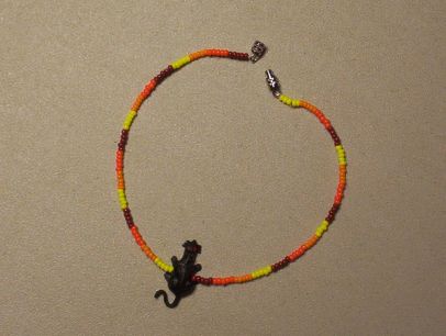 This is a cute little bracelet made of Yellow/Light Orange/Orange/Brown seed beads with a black approx 1" charm. The bracelet is approx. 9 1/2" long. This bracelet has a "barrel" type closure.