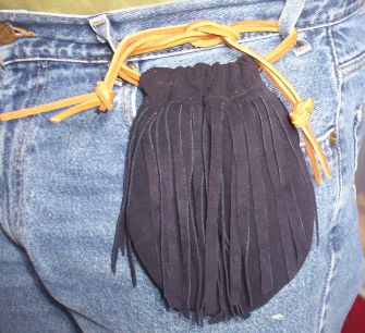 This little pouch is fun and functional. It is made from suede and is Navy Blue and measures approx 6" x 6 1/2" and closed with two draw rawhide draw stings. I designed this pouch myself and as you can see from the photo, my husband and I each have and use one. The photos are not great, the pouch is made from the same leather that the one my husband is wearing is made from for an idea of how it will look... The front side of the pouch is fully fringed with a third panel, the back side is not fringed.