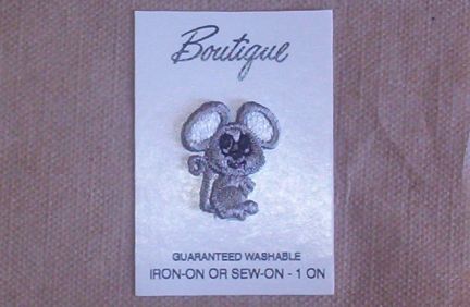 This is CUTE!! It is a iron or sew on gray in color emboridried applique. You can put it on cloth or other items. It is just over 1" x 1".