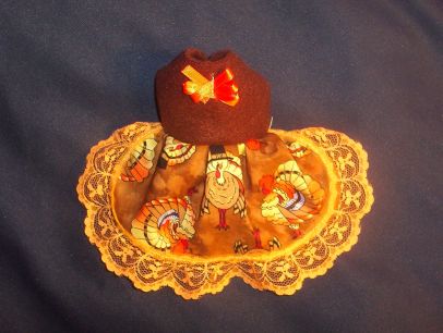 These little dresses are made in a variety of ways. This one is a cute little Thanksgiving Turkey Print skirt trimmed with orange lace and has a brown polar fleece top complete with a little orange bow that is fanned out like a turkeys tail feathers.