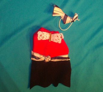 These little costume is adorable with a little red fleece top complete with lace front with gold glitter trim. It has a "skull cap" and a cute little sash to match at the waist.