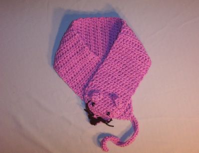 The scarf has been hand crocheted stitch by stitch. It is approx. 29 1/2" long with an approx 9" tail and is about 4 1/2" wide. The rat is Lilac/Pruple with koool pony bead eyes and Black yarn for the nose and whiskers. The ears stand out.