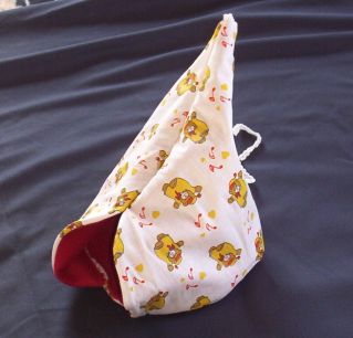 This item is a Fun little Rattie House. It is made like a Cornucopia. It is made with a cotton blend fabric over heavy weight polar fleece. It has a tie at the top and one in the rear to tie to your cage for stabilization.